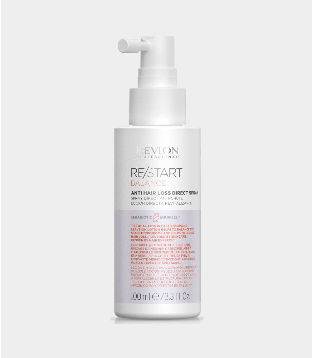 El RE/START Balance Anti Hair Loss Direct Spray de Revlon Professional es una loción capilar diseñada para ayudar a reducir la caída del cabello y mejorar el equilibrio del cuero cabelludo.