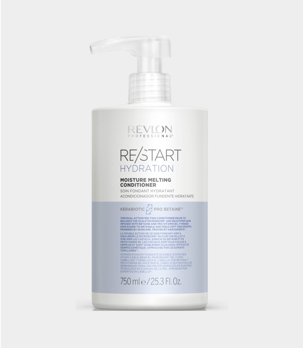 Revlon Professional RE/START Hydration Moisture Melting Conditioner es un acondicionador hidratante que ayuda a equilibrar el microbioma del cuero cabelludo mientras nutre profundamente el cabello. Su fórmula con tecnología Kerabiotic y Pro-Betaine™ deja el cabello suave, hidratado y fácil de desenredar.